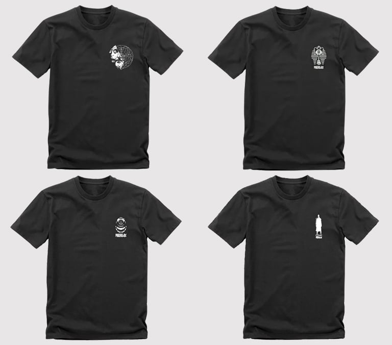 These are different artworks / chestprints, printed on Gildan Cotton Heavy Shirts. Click through the pictures and choose your design and size in the dropdown menu